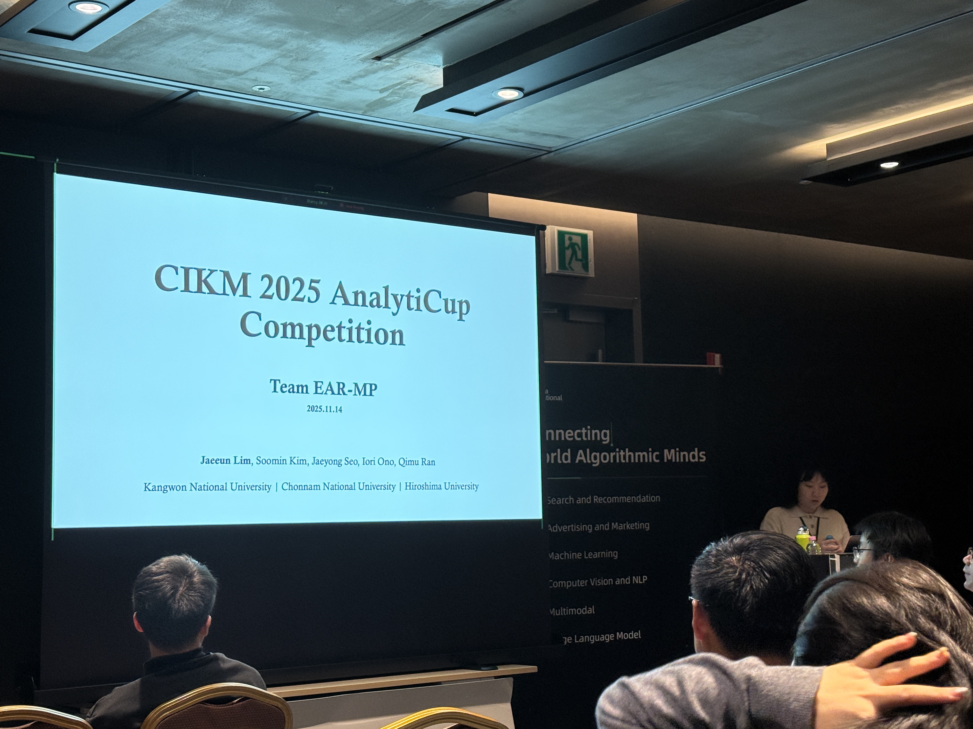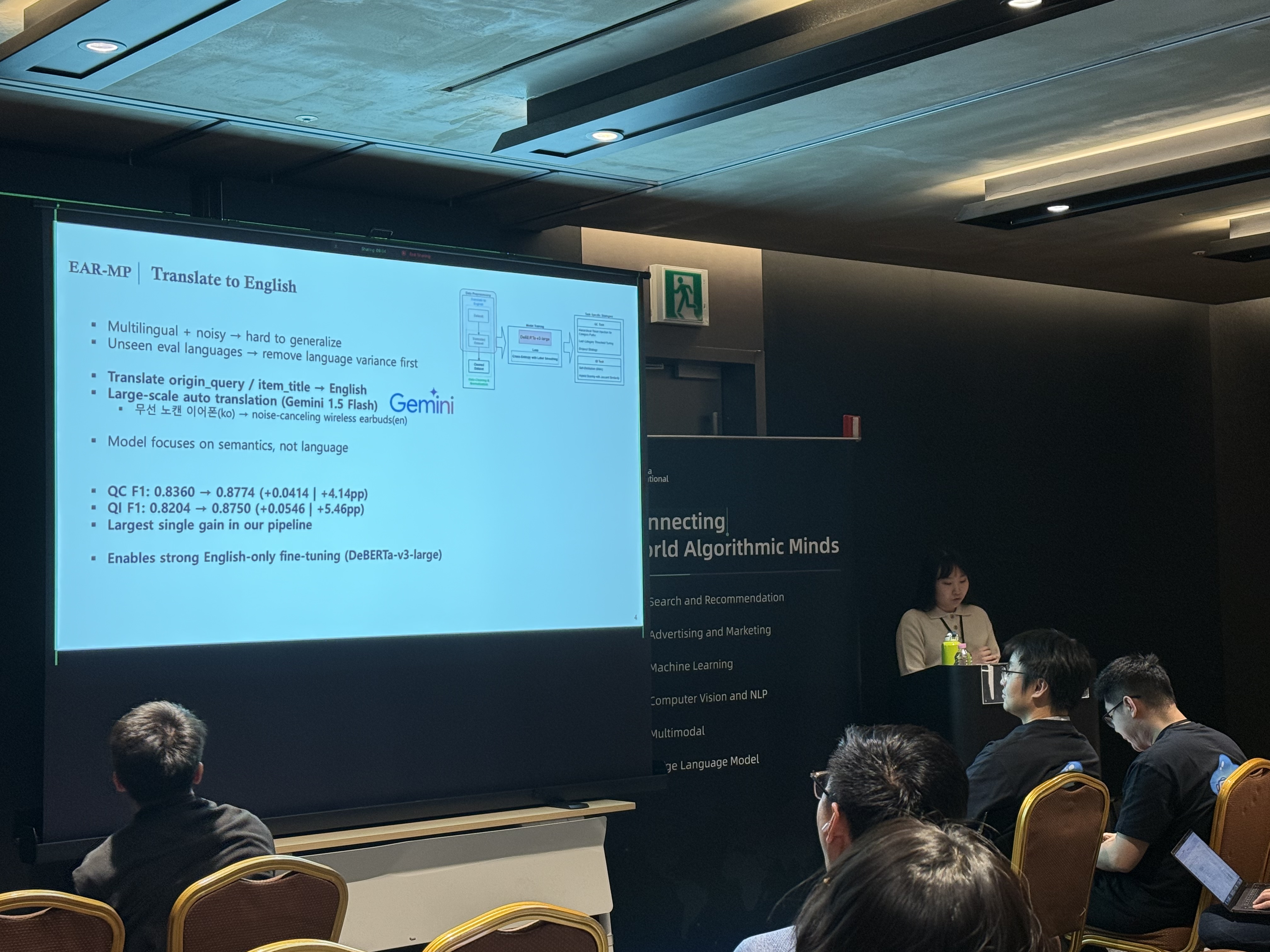 EAR-MP 팀은 국제 학술대회 CIKM 2025에서 개최되는 ‘CIKM 2025 AnalytiCup – Alibaba International E-commerce Product Search Competition: Multilingual Query-Category and Query-Item Relevance’ 부문에 출전해 최종 9위를 차지했다.